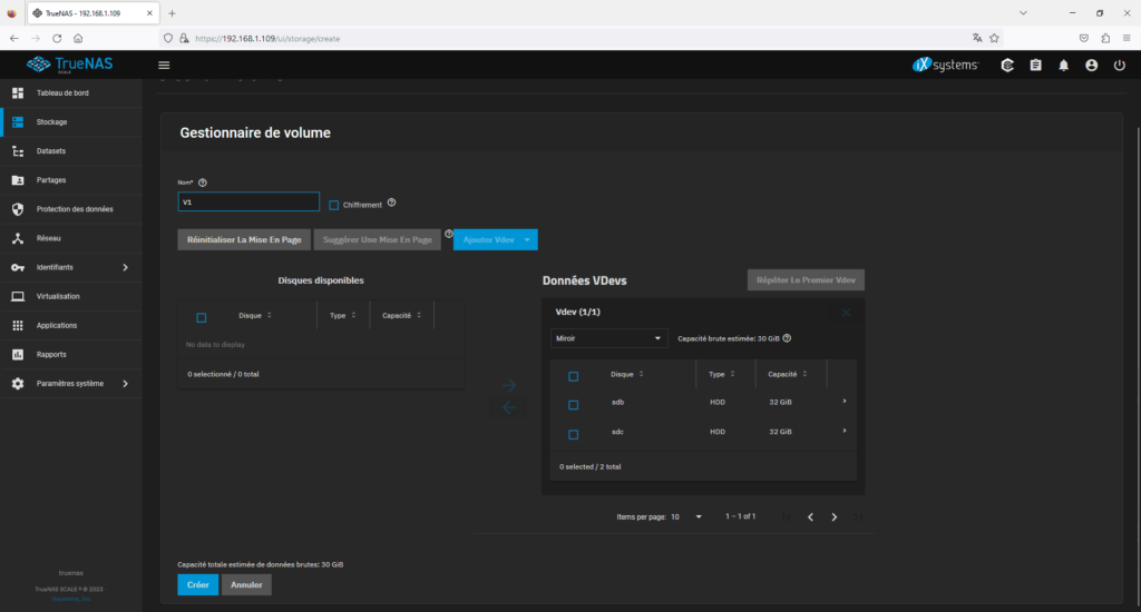 TrueNAS-SCALE-23.10.2 a été installé par un ami sur un Lenovo i3 8/120Go avec 2 disques durs en mirroir. Des datasets, des identifiants et des partages ont été créés mais il m’est impossible de créer des volumes…